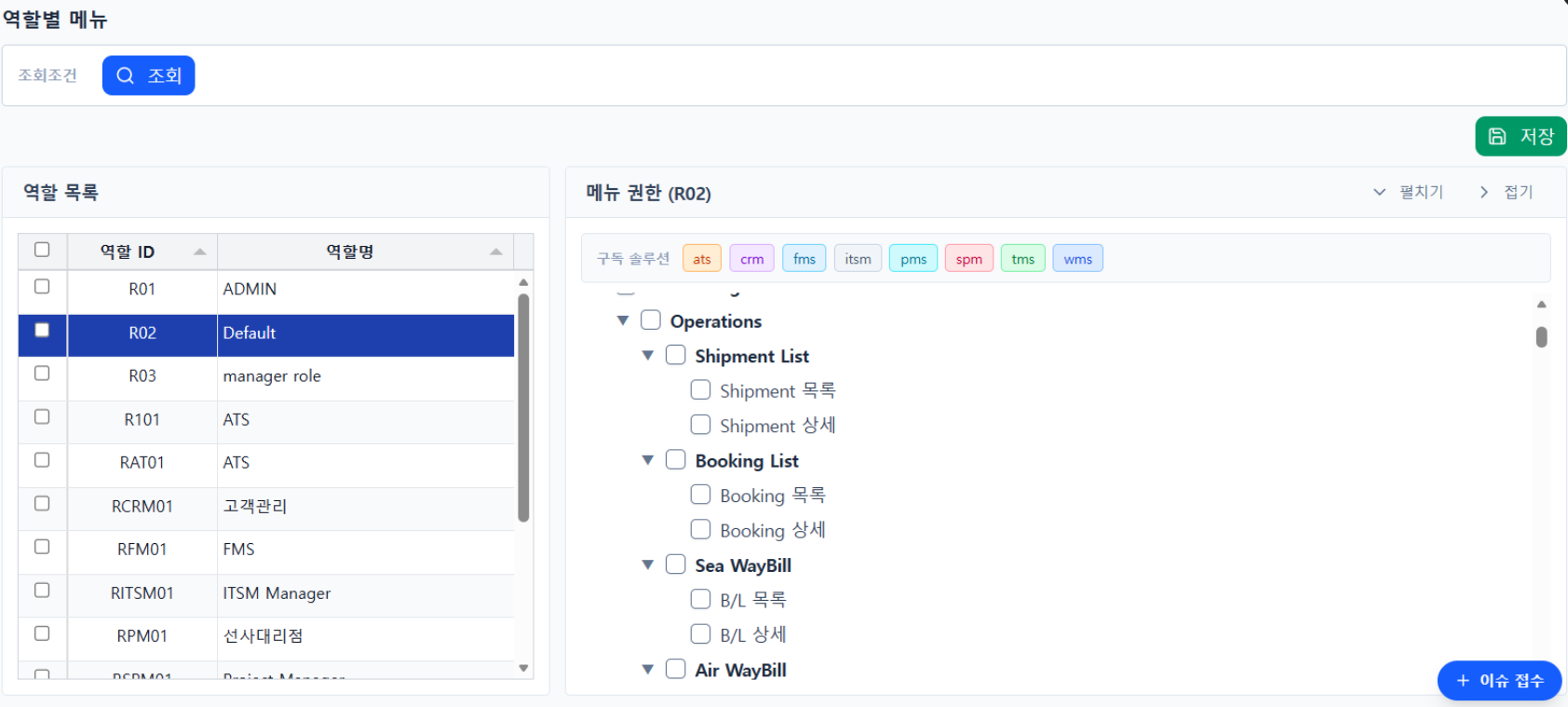 역할(Role) 단위로 메뉴·기능별 조회·수정·삭제 권한을 개별 설정합니다. 사용자에게 복수의 역할 부여가 가능합니다.